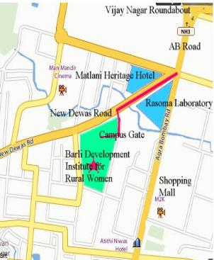 with AB Road at Rasoma Laboratory, which is located about 300 metres on the city side of Vijay Nagar Roundabout. Enter the New Dewas Road from A B Road at Rasoma Laboratory pass between Rasoma Laboratory on left and the new Matlani Heritage Hotel (under construction) on right, cross a bridge, turn immediate left, campus boundary wall is on right, after 50 metres entrance gate on right. |