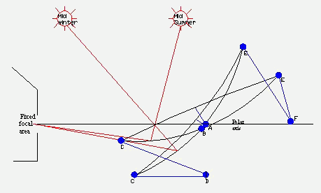 This drawing attempts to show the angle and shape of the dish during mid winter and mid summer, points A is attached