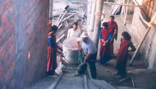 We bought some heavy wheels fitted them to the frame and wheeled the unit through what was a building site to the